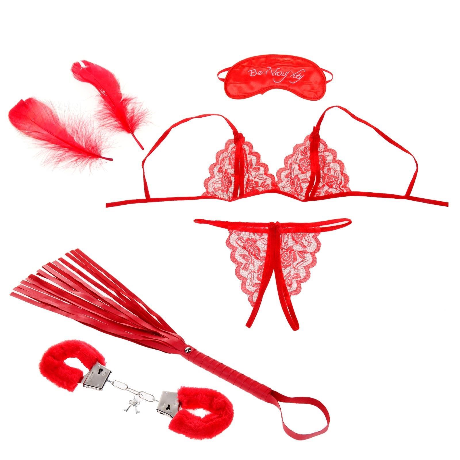 Набор для влюбленных из 7 предметов. В комплект входит маска на глаза, плеть, лиф и трусики из кружева, наручники с опушкой и 2 перышка.