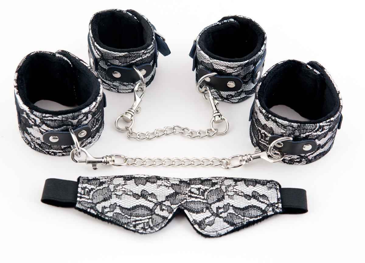 Набор: наручники, оковы и маска. Серебро и кружево - роскошное сочетание, чтобы в любой ситуации чувствовать себя неотразимой. Ты в полном подчинении у своего партнера. При такой игре вслепую чувства обострены и желания ярче.