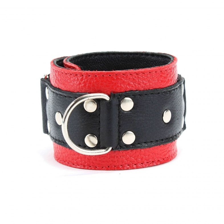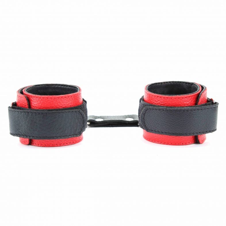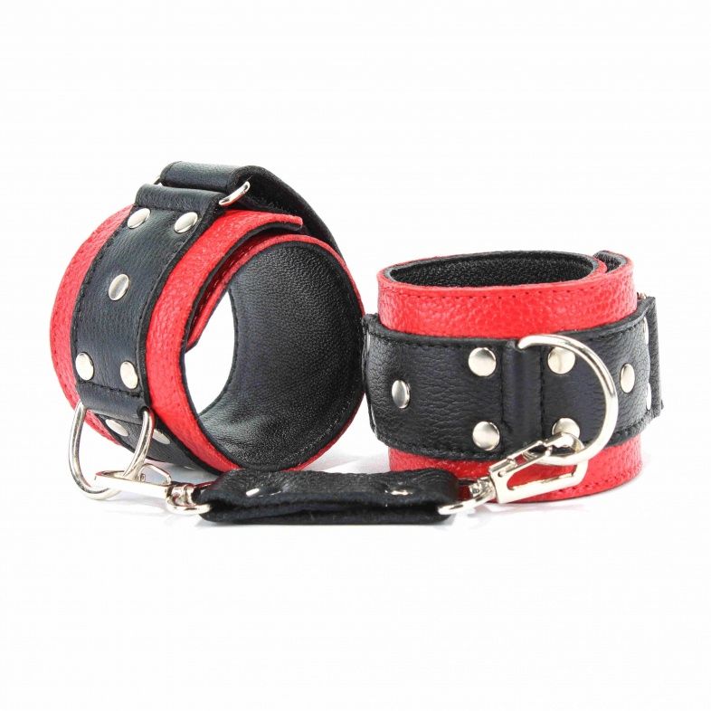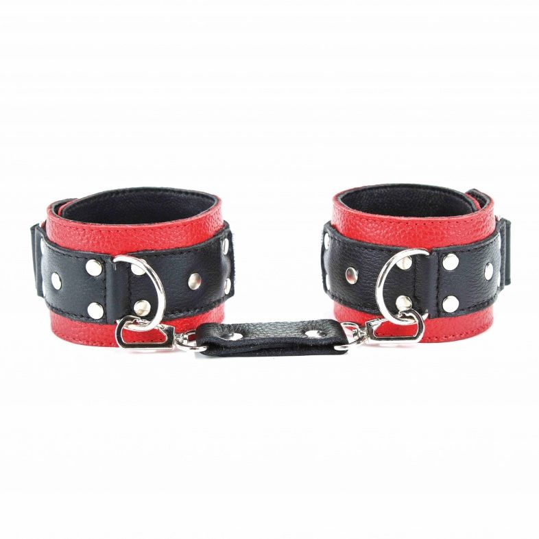 Кожаные наручники в красно-черной гамме. Украшены заклепками и соединяются между собой цепью с карабинами. Размер наручников регулируется при помощи застежки-липучки. Ширина - 5 см. Длина цепочки - 15,5 см.