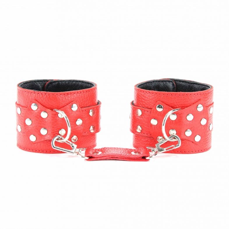 Красные наручники из натуральной кожи. Застегиваются при помощи массивных пряжек.