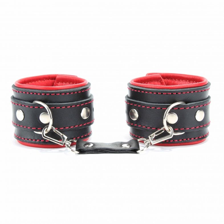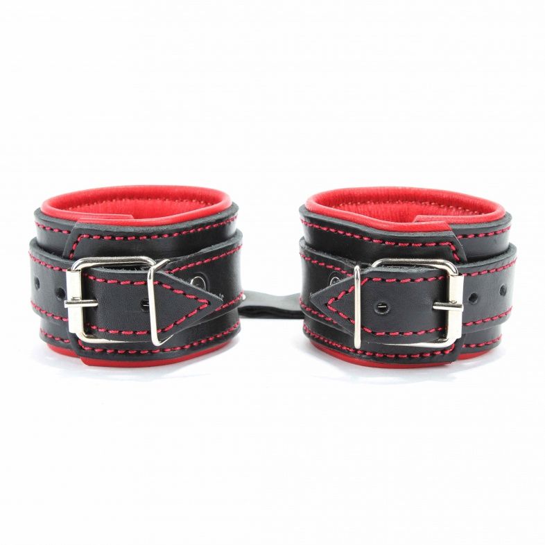 Оковы на руки с красным подкладом. Выполнены из толстой ременной кожи черного цвета, подклад мягкая перчаточная кожа ярко красного цвета. На пряжке. Использована усиленная металлическая фурнитура. Строчка толстой ниткой контрастного красного цвета.
