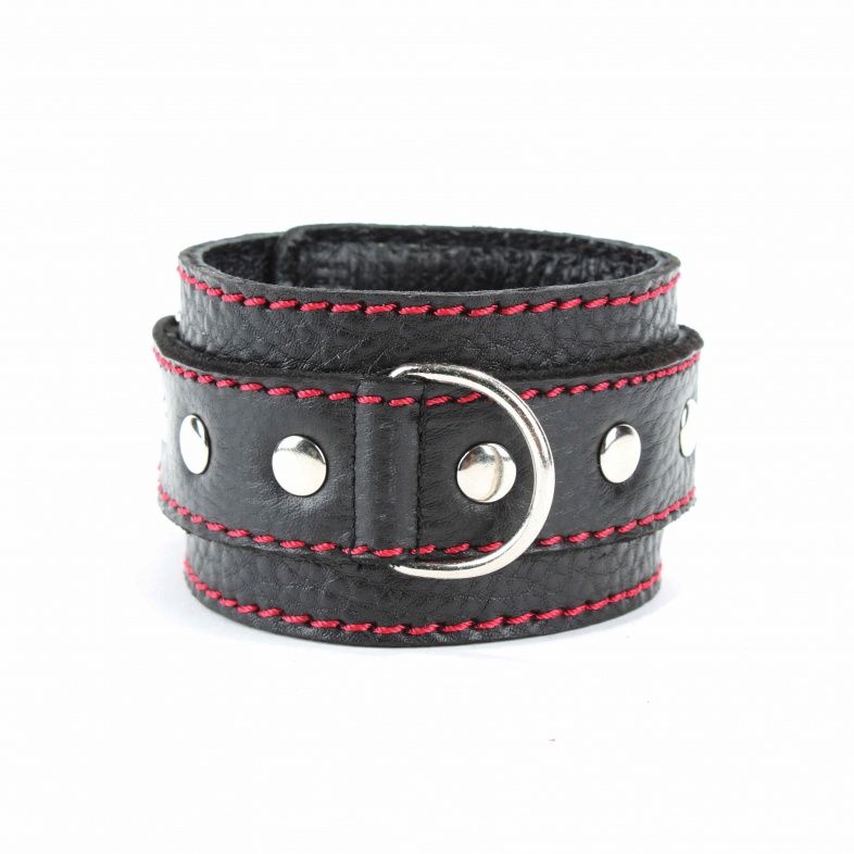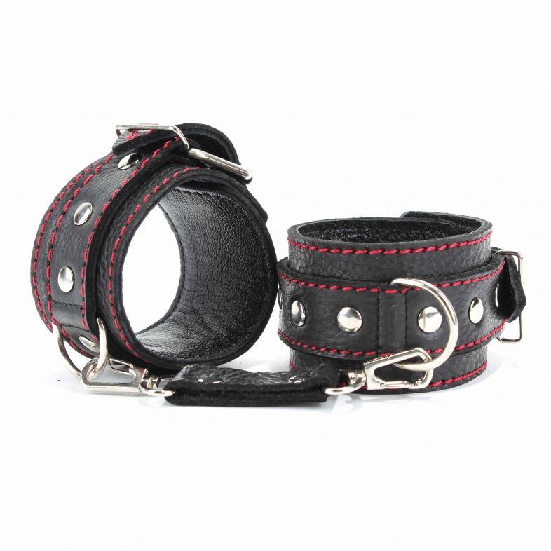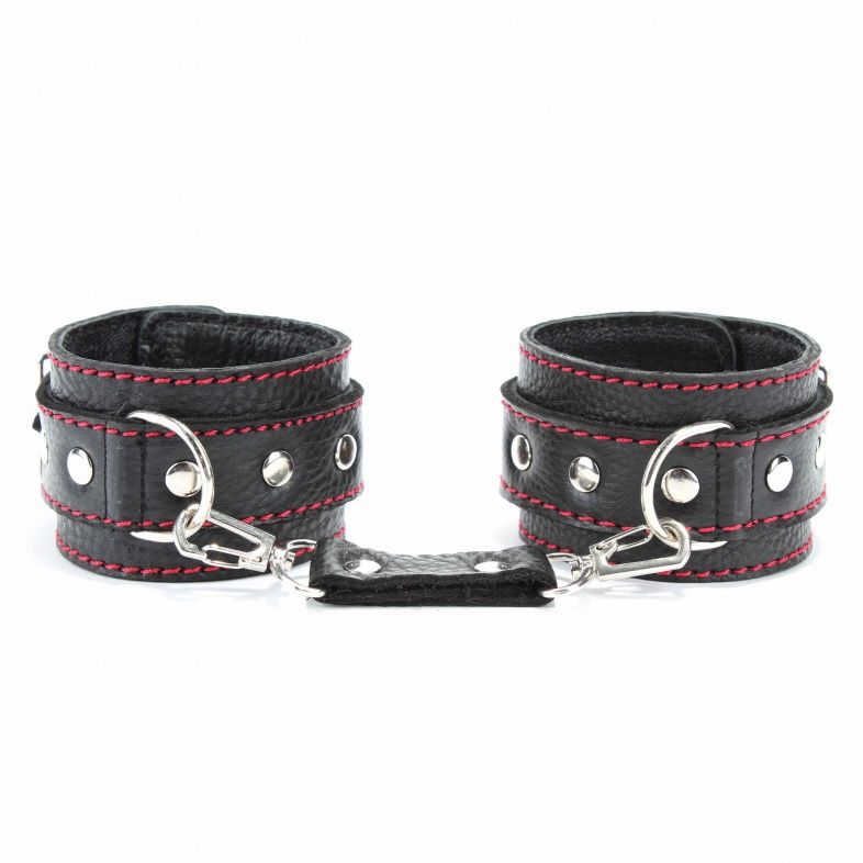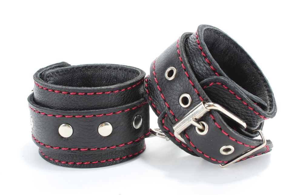 Оживить эротические игры Вам помогут наручники. Этот интимный аксессуар пользуется успехом. Выполненные в черном цвете с красной строчкой и декорированы заклепками. Модный интимный аксессуар не сдавливает и не нарушает кровообращение, так как изготовлен из мягкой кожи. Чтобы любимая никуда не убежала, наручники соединены короткой перемычкой. Длина перемычки - 6 см. Ширина оков - 5 см.