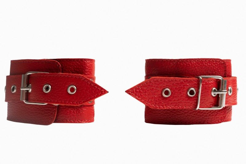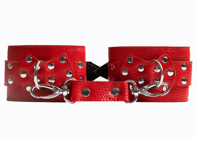 Наручники выполнены из натуральной кожи, текстурированные. Декорированы заклепками и бантом с металлическим кольцом. Несмотря на брутальность, смотрятся на теле очень эффектно и сексуально. Наручники надежно фиксируются пряжками и ремнями, позволяющими выбрать нужный размер. Внутренняя подкладка мягкая, контрастного цвета. Она не доставит неприятных ощущений, благодаря тому, что вся металлическая фурнитура спрятана за ней. Кожаное соединение на карабинах фиксирует наручники вместе. Аксессуар позволяет в полной мере насладиться сексом в стиле БДСМ. Ширина наручников - 6 см., ремешка - 3 см. Обхват - 25 см.