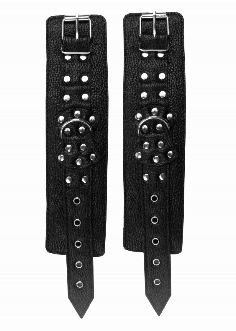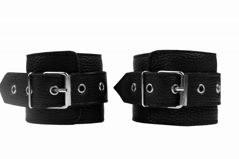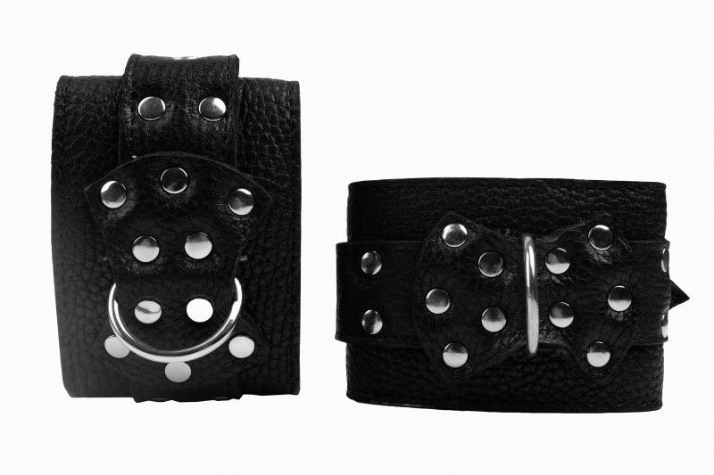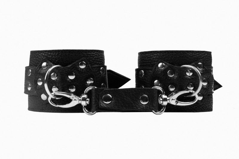 Наручники выполнены из натуральной кожи, текстурированные. Декорированы заклепками и бантом с металлическим кольцом. Несмотря на брутальность, смотрятся на теле очень эффектно и сексуально. Наручники надежно фиксируются пряжками и ремнями, позволяющими выбрать нужный размер. Внутренняя подкладка мягкая, контрастного цвета. Она не доставит неприятных ощущений, благодаря тому, что вся металлическая фурнитура спрятана за ней. Кожаное соединение на карабинах фиксирует наручники вместе. Аксессуар позволяет в полной мере насладиться сексом в стиле БДСМ. Ширина наручников - 6 см., ремешка - 3 см. Обхват - 25 см.