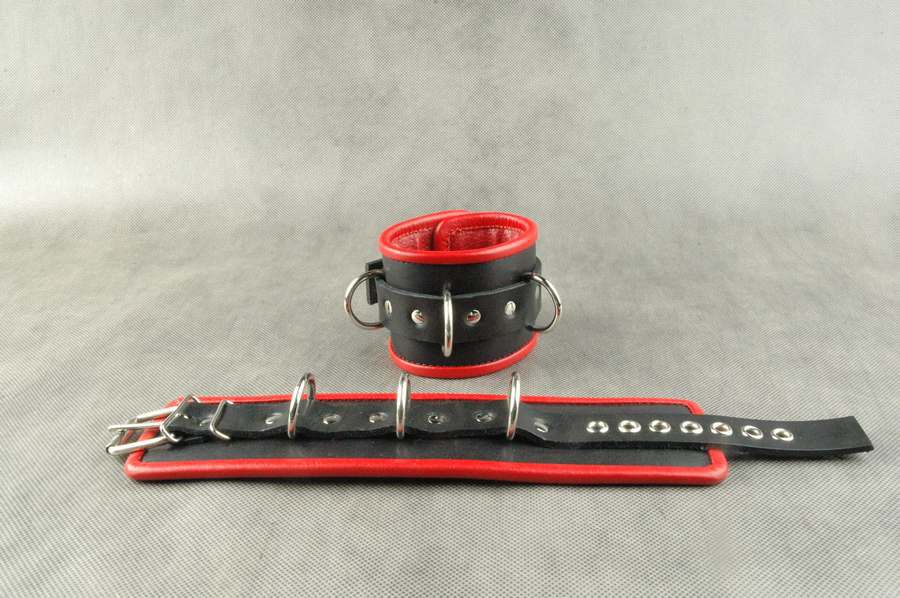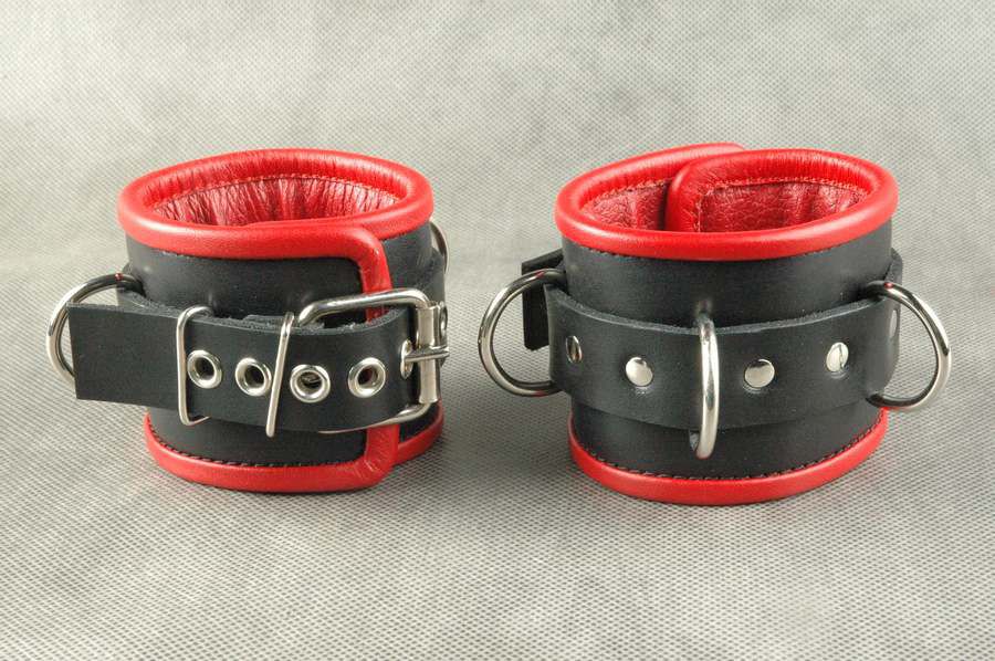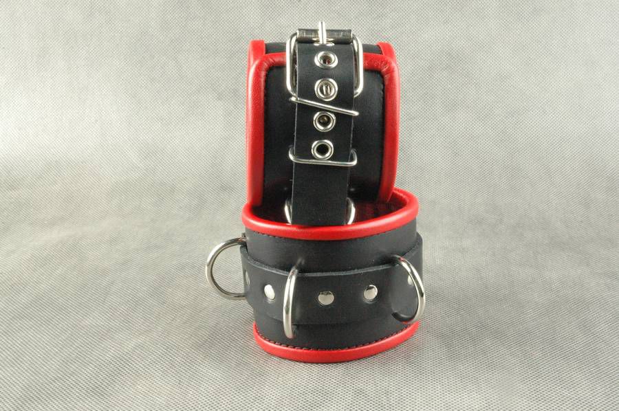 Наручники подшитые. Застежка - ремешок с металлической пряжкой. Имеются 3 сварных кольца. Отделочный край и мягкая проставка внутри, обтянуты красной кожей. Не имеет соединительной фиксации. Ширина - 7 см.