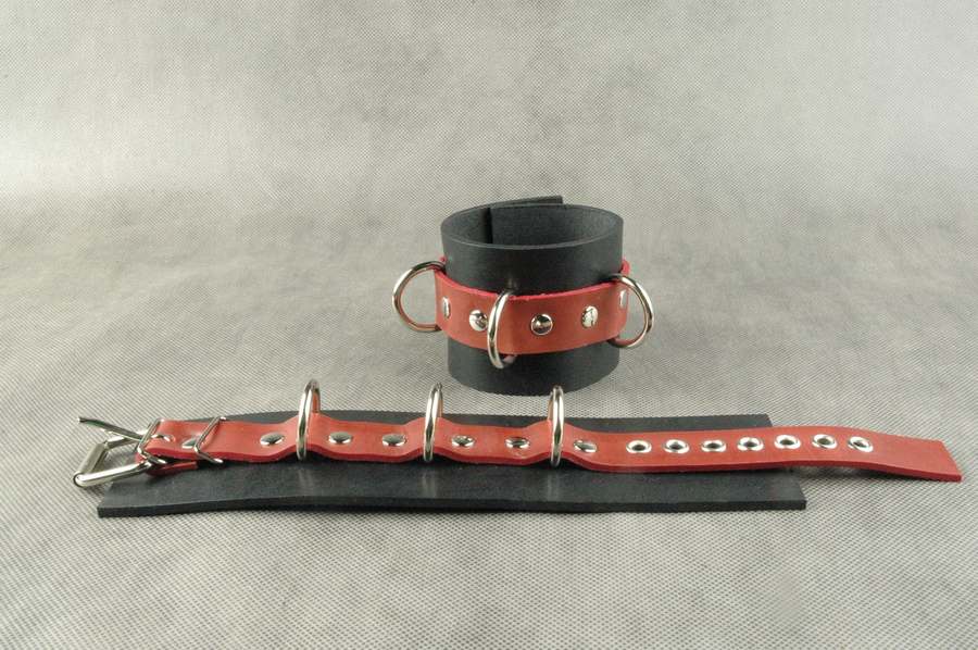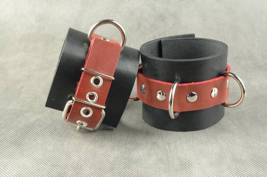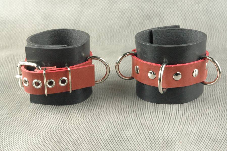 Наручники не подшитые. Имеют застежку - ремешок из красной кожи с металлической пряжкой, 3 сварных D - кольца. Без соединительной фиксации. Ширина - 6,5 см.