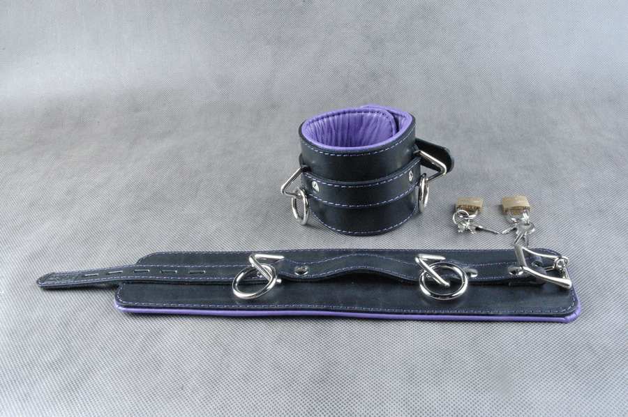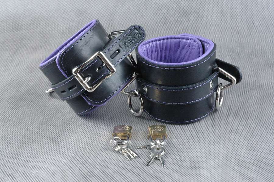 Подвернутые застежка — ремешок с эллипсными отверстиями и запирающейся пряжкой «бабочкой», с замочком для фиксации. База с 2 треугольниками с кольцом, с мягкой проставкой внутри, обтянутой лиловой кожей с подворотом. Без соединительной фиксации.
