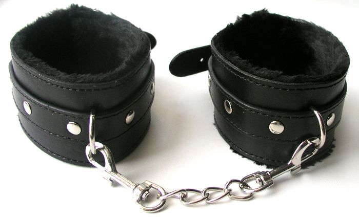 Проклёпанные браслеты из искусственной кожи с ремешками соединены между собой лишь коротенькой цепочкой с карабином.