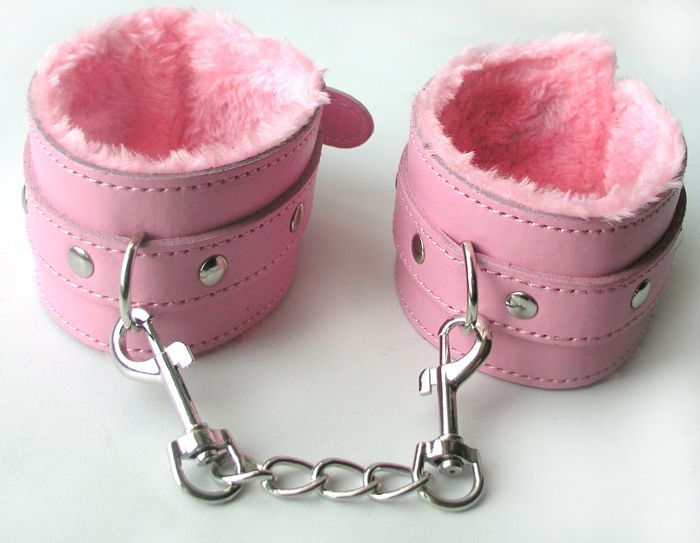 Проклёпанные браслеты из искусственной кожи с ремешками соединены между собой лишь коротенькой цепочкой с карабином.
