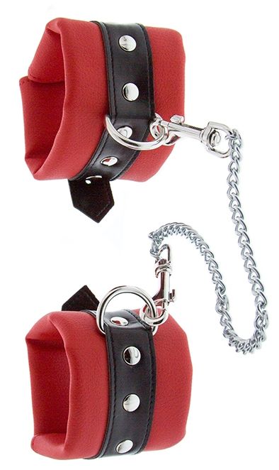 Красно-чёрные наручники HANDCUFFS WITH CHAINS на карабинах и металлической цепочке. Длина цепочки - 33 см.