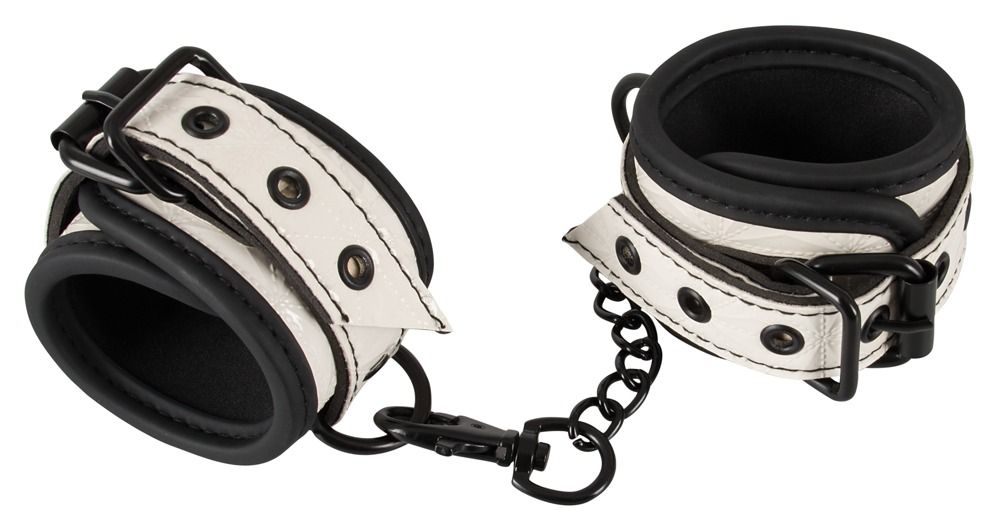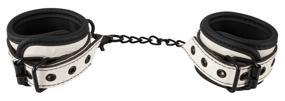 Черно-белые наручники на цепочке. Ширина каждого браслета - 5,5 см.