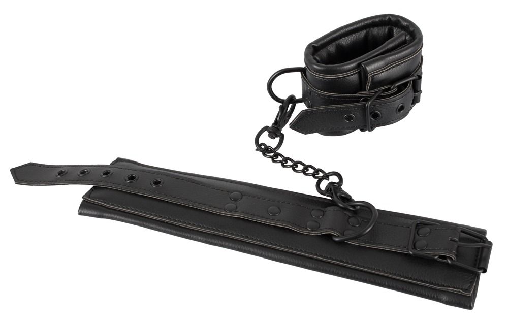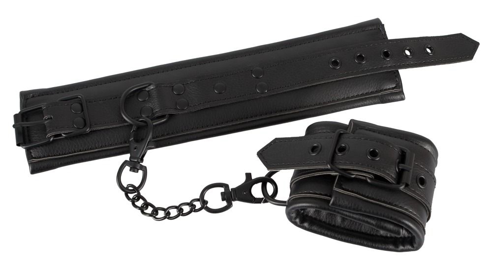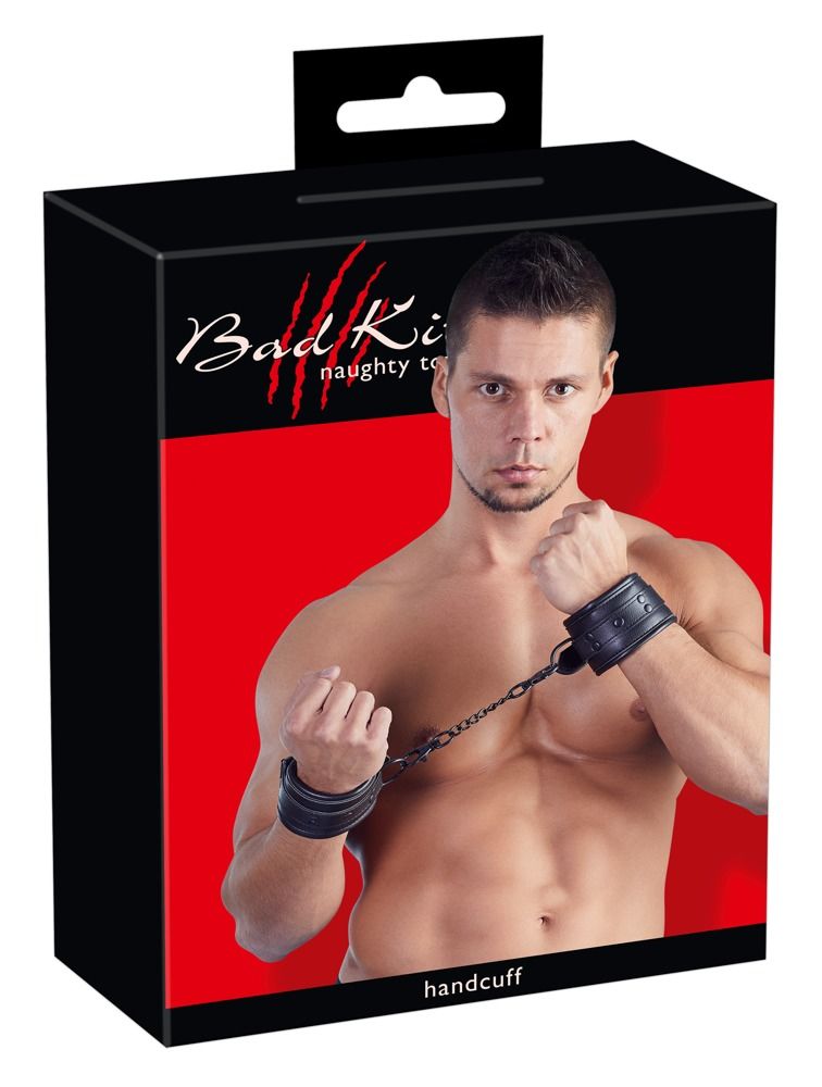 Черные наручники от Bad Kitty с мягкими манжетами из искусственной кожи. Диаметр от 18 до 28 сантиметров, регулируется с помощью застежки-пряжки. Цепь, пряжка и шпильки окрашены в матовый цвет. Обхват манжет - от 18 до 28 см. Длина цепи с карабинами - 16 см.