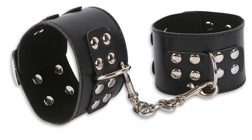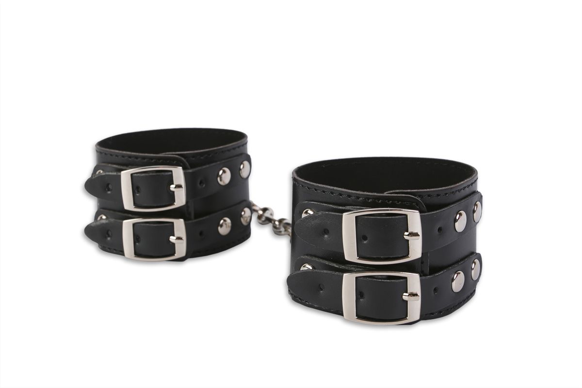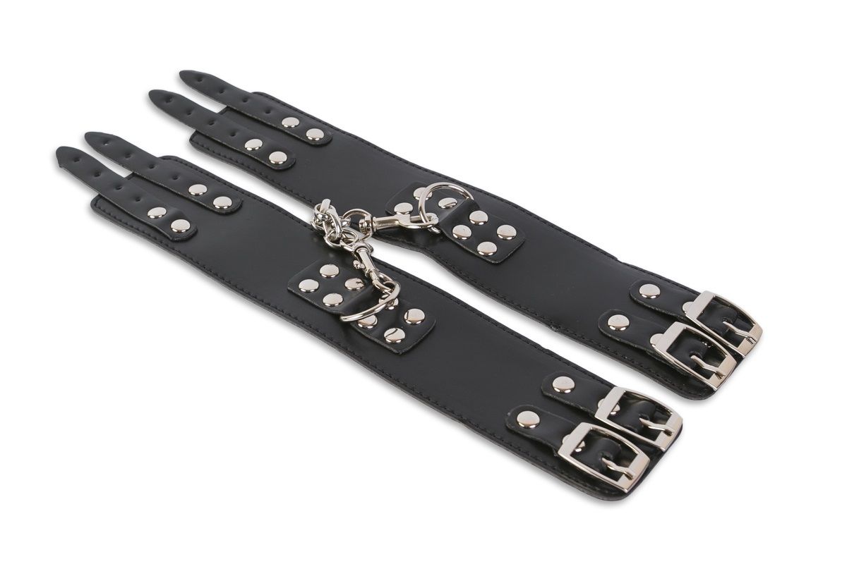 Брутальный атрибут, который понравится опытным любителям БДСМ. Облачите своего Раба в эти манжеты, ограничив его движения, и насладитесь незабываемыми ощущениями собственного превосходства! Широкие манжеты выполнены из высококачественного кожзаменителя. Края аксессуара обработаны контрастными швами. На манжетах есть по паре ремешков с пряжками, с помощью которых можно регулировать их размер. Манжеты соединены цепочкой, поэтому могут использоваться в качестве фиксаторов для рук и ног. Ширина - 5,5 см.
