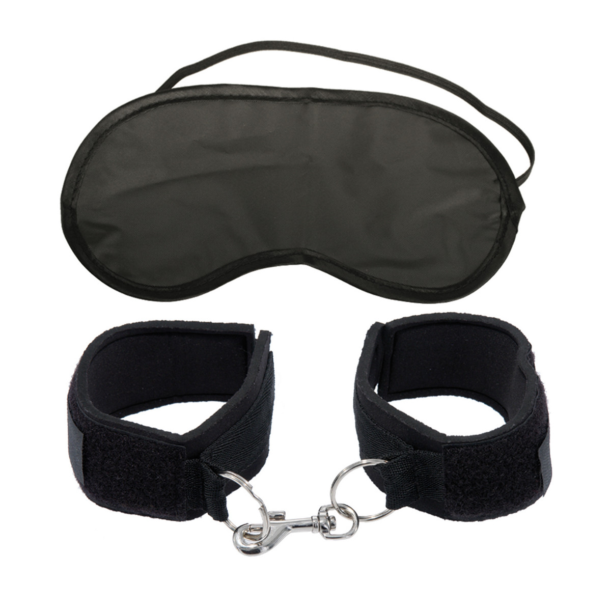 Мягкие оковы черного цвета, выполнены из эластичного материала, соединенные между собой при помощи железного карабина. Размер регулируется при помощи застежек-липучек. В комплекте черная маска на глаза.
