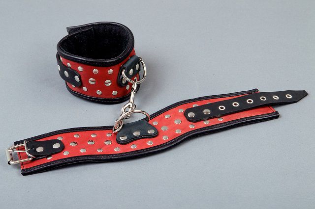 Фигурные наручники ручной работы — это Ваш помощник в реализации самых необузданных фантазий в стиле БДСМ. Данные наручи не нарушают кровообращение, просты в применении и обеспечивают надежную фиксацию. Эта модель изготовлена из натуральной кожи черного цвета. Наручи имеют анатомическую форму,мягкая подкладка(пена) и дополнительная окантовка обеспечат комфорт и безопасность. Рисунок из заклепок повторяет изгиб боковых линий окантовки наручей. На полукольце в центре каждого наручника закреплен карабин. Минимальный обхват руки - 21 см., максимальный - 26 см.