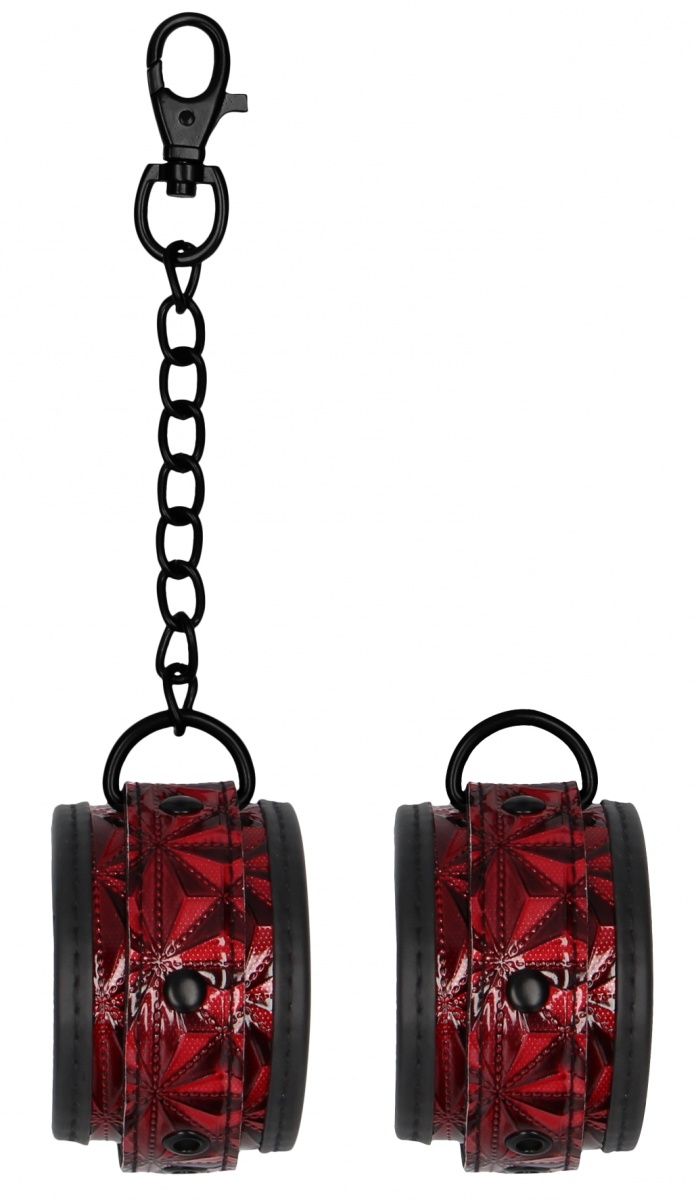 Luxury Hand Cuffs – специализированное приспособление с фиксацией рук для обездвиживания партнера при эротических ролевых играх и практиках БДСМ. Аксессуар состоит из двух сверхпрочных и стильных широких полос из блестящего винила с ромбовидным рисунком, соединенных между собой снимающейся зачерненной цепочкой с карабинами по обоим бокам. Для максимального комфорта во время использования наручники имеют мягкую вставку из неопрена, закрывающую швы и стыки и защищающую запястья. Фиксация осуществляется с помощью ремешка с классической пряжкой. Имеется 6 отверстий, за счет чего можно идеально подобрать требуемый размер с идеальным плотным обхватом. Длина цепочки - 15,5 см.