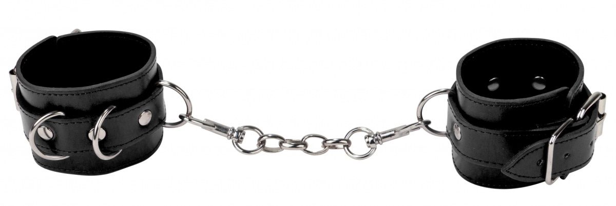 Чёрные наручники из натуральной кожи. Между собой манжеты из кожи соединяются металлическими кольцами. Манжеты из кожи, как строгая нотка ласкового контакта пробуждают в партнёрах новые пикантные чувства. Размер наручников - до 25 см. в окружности.