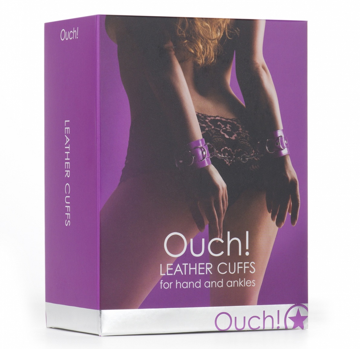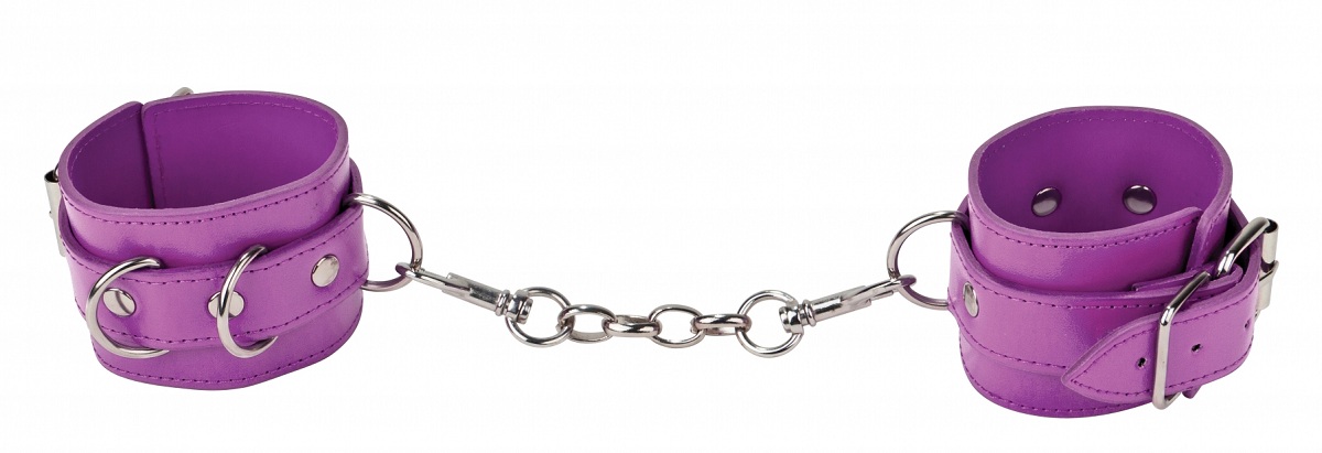 Наручники, изготовленные из качественной кожи с элегантной строчкой. Имеется 6 отверстий для регулировки длины. Украшены заклепками, соединены между собой карабинами. Ширина манжет - 5,5 см.