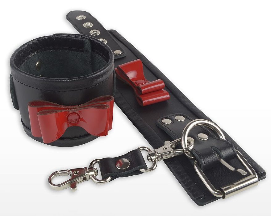 Аксессуар состоит из двух широких полос из плотной натуральной высококачественной кожи черного цвета, украшенных контрастными красными лаковыми объемными бантами, соединенных между собой снимающейся короткой сцепкой в виде карабинов. По краю наручников проходит оторочка, обеспечивающая комфорт при ношении. Оденьте наручники на запястья и с помощью никелированных пряжек зафиксируйте ремни. Ширина - 5,3 см.