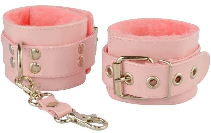 Нежные наручники из искусственной лаковой кожи. Внутренняя сторона изделия отделана мягким искусственным мехом. Соединяются наручники при помощи перемычки с двумя карабинами. Ширина - 5,5 см.
