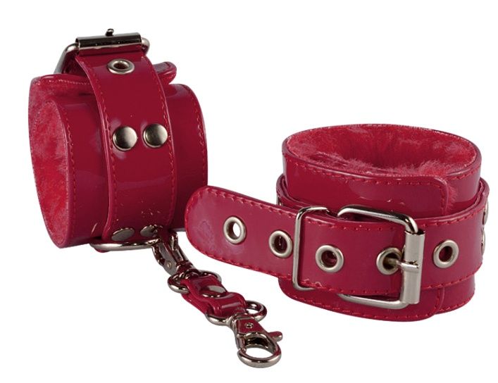 Нежные наручники из искусственной лаковой кожи. Внутренняя сторона изделия отделана мягким искусственным мехом. Соединяются наручники при помощи перемычки с двумя карабинами. Ширина - 5,5 см.