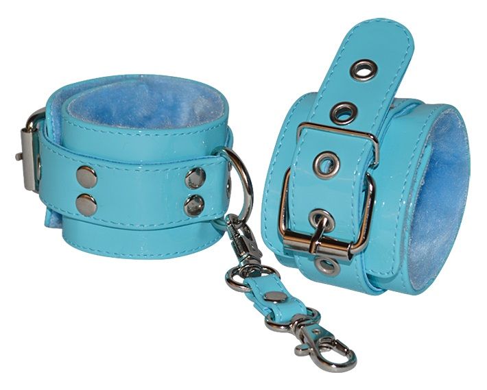 Яркие наручники из искусственной лаковой кожи голубого цвета. Внутренняя сторона изделия отделана мягким искусственным мехом. Соединяются наручники при помощи перемычки с двумя карабинами. Длина манжет - 30 см. Ширина - 5,5 см.