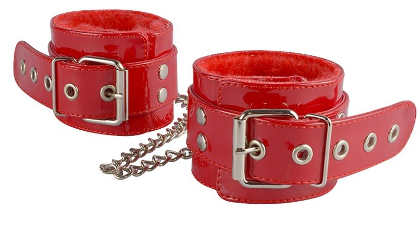 Яркие оковы из искусственной лаковой кожи красного цвета. Внутренняя сторона изделия отделана мягким искусственным мехом. Соединяются оковы при помощи цепочки с двумя карабинами. Длина манжет - 35 см. Ширина - 6 см.