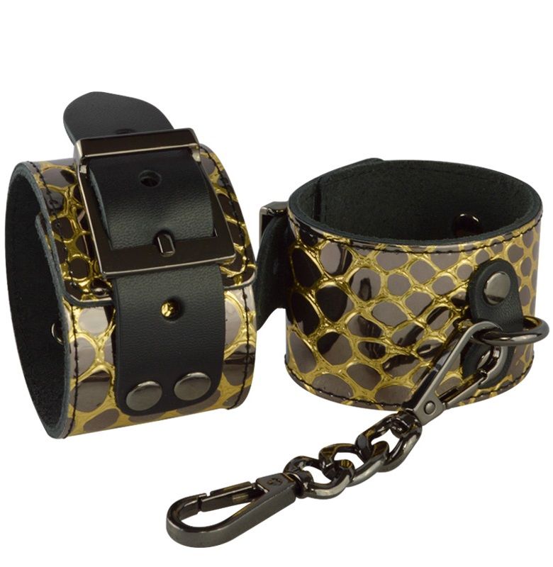 Наручники изготовлены из натуральной кожи. Регулируются при помощи металлических пряжек. Наручники соединяются карабинами. Ширина - 4,6 см.