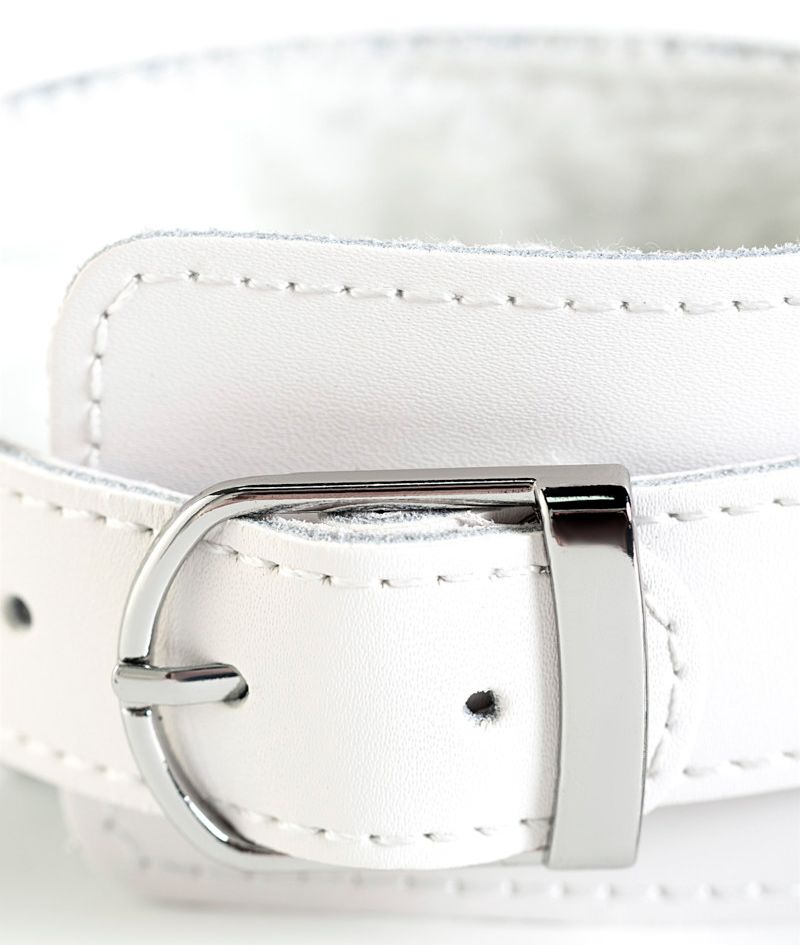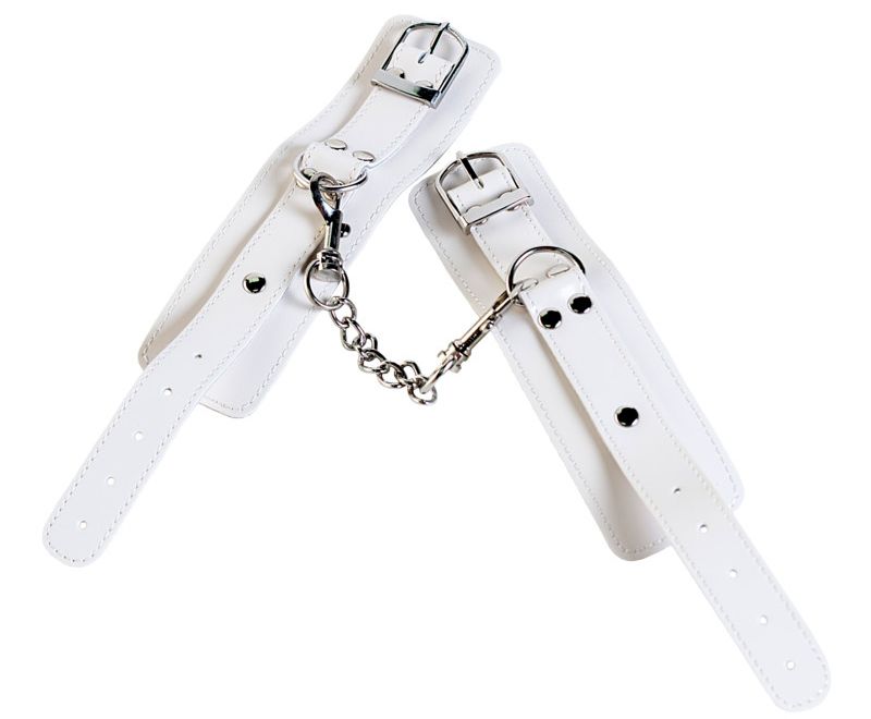 Белые кожаные наручники с мехом внутри. Между собой сцеплены 2 карабинами и цепочкой. Длина цепочки - 7 см.