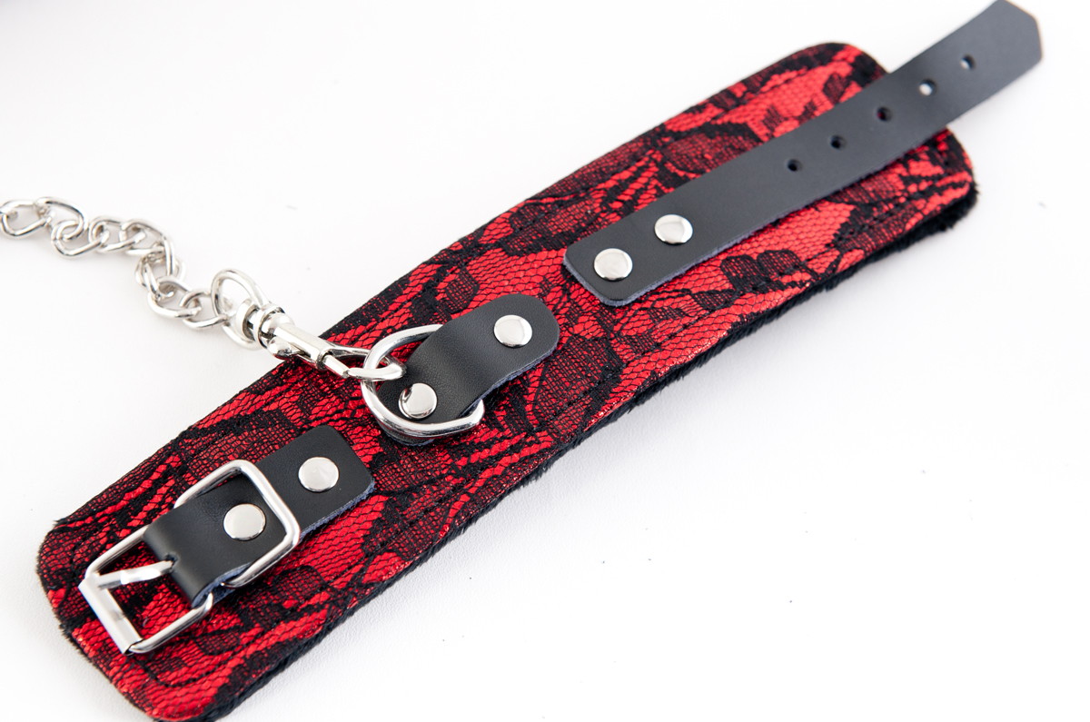 Изящное черное кружево на ярко - красном фоне. Более сексуального сочетания не существует. Что это - винтажное украшение или изысканное ограничение свободы - решайте вместе с партнером.