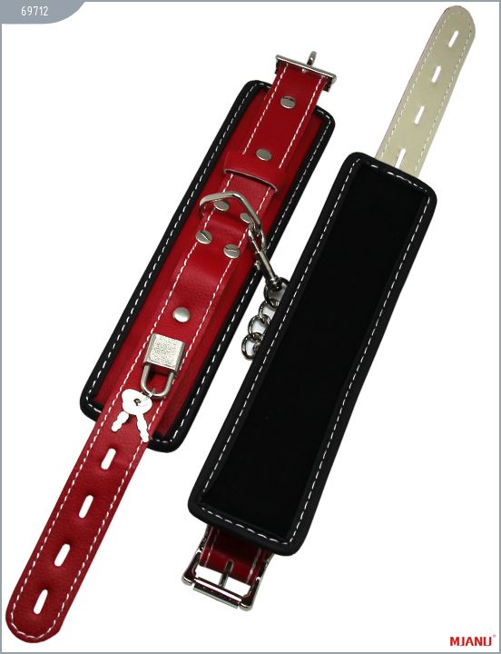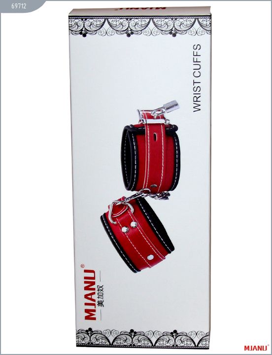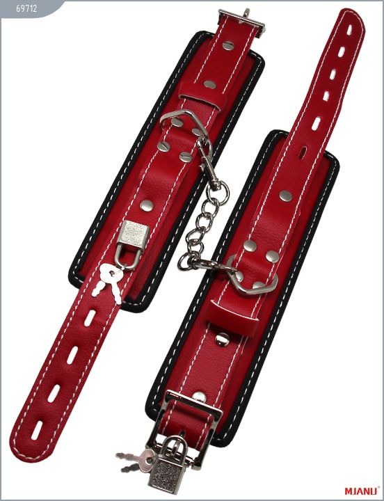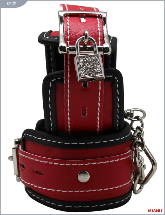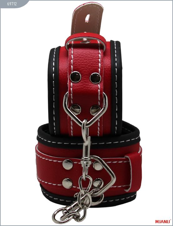 Наручники Mjanu — высококачественное изделие с современной фурнитурой, аккуратными креплениями и отличной контрастной белой строчкой. Изготавливаются из кожи c PU покрытием, которая сохраняет свойство натуральной кожи пропускать воздух и устойчивость к деформации, но в отличии от натуральной кожи имеет более привлекательный внешний вид. Яркие наручники сшиты на велюровой подкладке. Между слоем кожи и велюровой подкладкой проложена дополнительно мягкая прокладка для более комфортного использования в БДСМ играх. Соединяются наручники между собой короткой цепочкой с двумя карабинами на концах. Они не нарушают кровообращение и обеспечивают надёжную фиксацию с помощью пары замков. Размер регулируется при помощи ремешков. Длина с ремешком — 35 см. Ширина — 5,5 см.