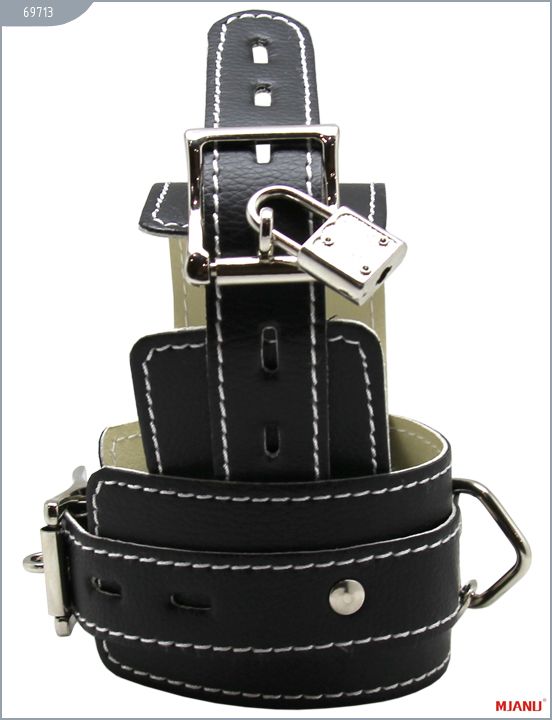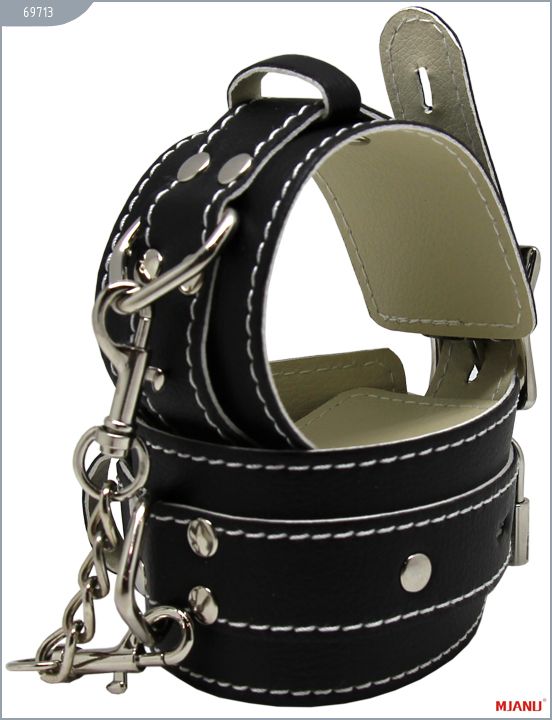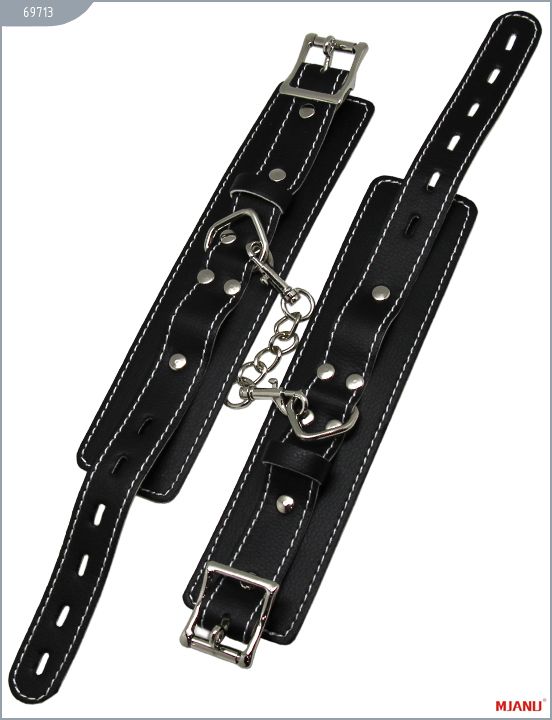 Наручники Mjanu — высококачественное изделие с современной фурнитурой, аккуратными креплениями и отличной контрастной белой строчкой. Изготавливаются из натуральной кожи c PU покрытием, которая сохраняет свойство натуральной кожи пропускать воздух и устойчивость к деформации, но в отличии от натуральной кожи имеет более привлекательный внешний вид. Соединяются наручники между собой короткой цепочкой с двумя карабинами на концах. Они не нарушают кровообращение и обеспечивают надёжную фиксацию с помощью пары замков. Размер регулируется при помощи ремешков. Длина с ремешком - 35 см., ширина - 5,5 см.