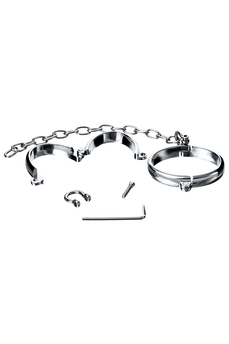 Небольшие наручники на сцепке, дающей небольшую свободу в движении руками. Открываются с помощью ключа-шестигранника, входящего в комплект. Внутреннее сечение - 5 x 7 cм.