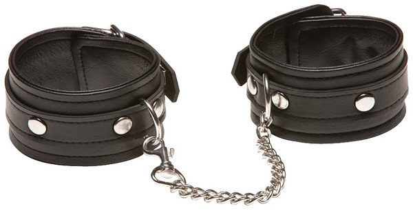 Проклёпанные браслеты из искусственной кожи с ремешками соединены между собой лишь коротенькой цепочкой с карабином. Ваш сабмиссив никуда не убежит от заслуженного наказания, если его ноги стянуты этими оковами. Ограничив свободу движений, вы можете делать с «нижним» ВСЁ! Длина цепочки - 15,5 см.