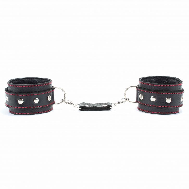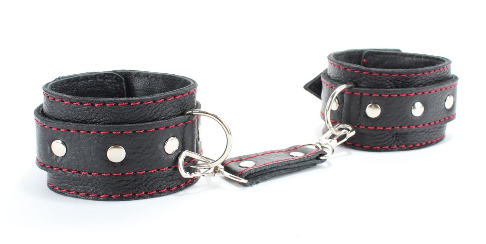 Оживить эротические игры Вам помогут поножи. Этот интимный аксессуар пользуется успехом. Выполненные в черном цвете с красной строчкой и декорированы заклепками. Модный интимный аксессуар не сдавливает и не нарушает кровообращение, так как изготовлен из мягкой кожи. Чтобы любимая никуда не убежала, поножи соединены короткой перемычкой. Длина перемычки - 6 см. Ширина оков - 6 см.