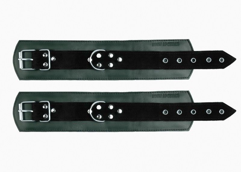 Оковы выполнены из натуральной кожи. Внутренняя подкладка мягкая, не доставит неприятных ощущений, благодаря тому что вся металлическая фурнитура спрятана за ней. За счёт карабинов легко разъединяются и быстро застёгиваются. Подойдут как для новичков, так и для профессионалов. Изделие декорировано ремнями из замши контрастного цвета. Посредине аксессуара расположено полукольцо из сварной фурнитуры. Оковы надежно фиксируются пряжками и ремнями, позволяющими выбрать нужный размер. Стильный аксессуар, отлично подходят для воплощения эротических БДСМ игр. Обхват наножников - 28 см., ширина - 6 см. Ширина ремешков - 2,5 см.