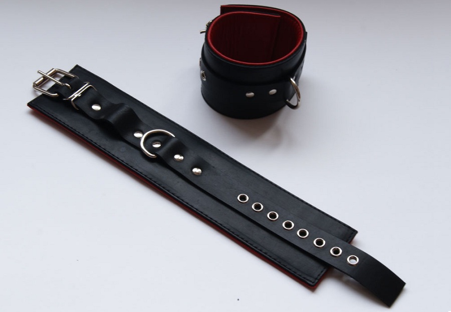 Наножники подшитые. Застежка - ремешок с металлической пряжкой. Имеется 1 сварное D - кольцо. Внутри вставлена мягкая проставка, обтянутая красной кожей. Без соединительной фиксации. Ширина - 7 см.