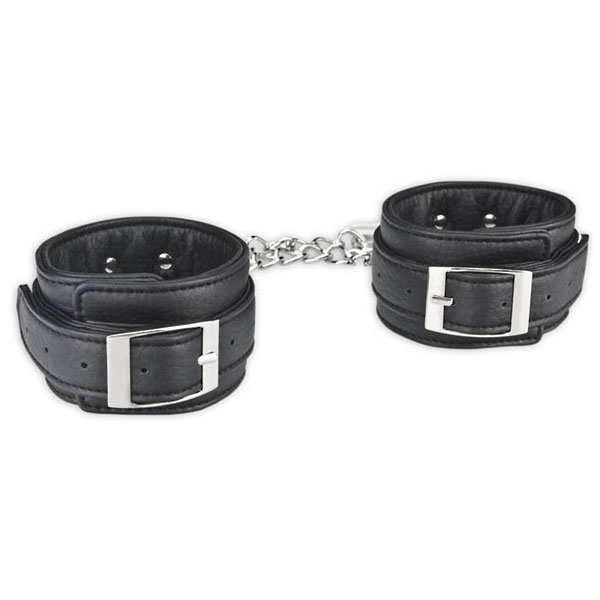 Поножи из искусственной качественной кожи в стиле унисекс. Классический дизайн с металлическими пряжками для регуляции размера, между собой браслеты соединены цепью, закрывающейся на замок с ключами (есть в комплекте). One size.