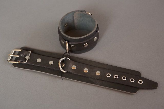 Узкие поножи ручной работы — это ваш помощник в реализации самых необузданных фантазий в БДСМ-сессиях. Они не нарушают кровообращение, просты в применении и обеспечивают надежную фиксацию. Данный девайс изготовлен из жесткой натуральной кожи, украшен одним рядом заклепок. Поножи фиксируются при помощи ремешка с пряжкой. D-образные кольца позволяют присоединять различные бандажные системы (карабины, ленты, веревки). Поножи без подкладки,не подшитые. Ширина - 5 см. Минимальный обхват ноги у щиколотки - 22 см,максимальный - 31 см.