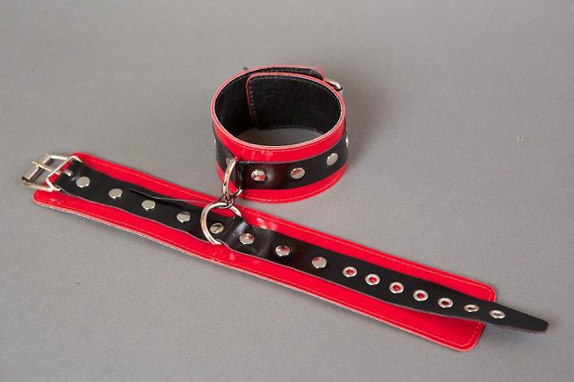 Узкие поножи ручной работы — это ваш помощник в реализации самых необузданных фантазий в БДСМ-сессиях. Они не нарушают кровообращение, просты в применении и обеспечивают надежную фиксацию. Данный девайс изготовлен из лаковой натуральной кожи, украшен одним рядом заклепок. Поножи фиксируются при помощи ремешка с пряжкой. D-образные кольца позволяют присоединять различные бандажные системы (карабины, ленты, веревки). Подкладка обеспечивает комфортное использование и безопасность. Ширина - 5 см. Минимальный обхват ноги у щиколотки - 22 см., максимальный - 31 см.