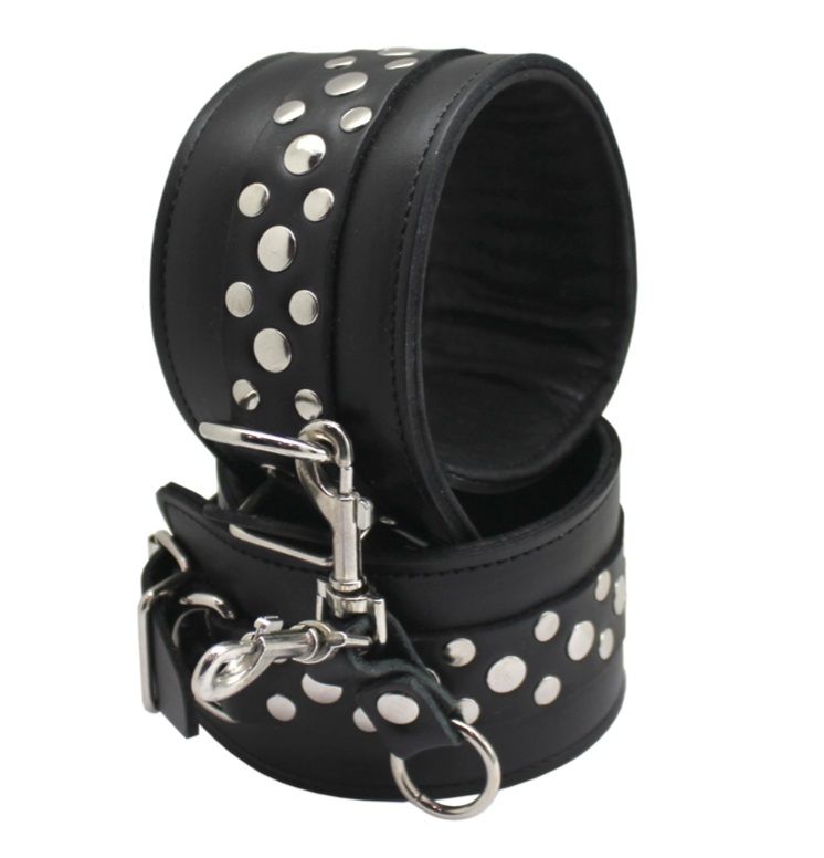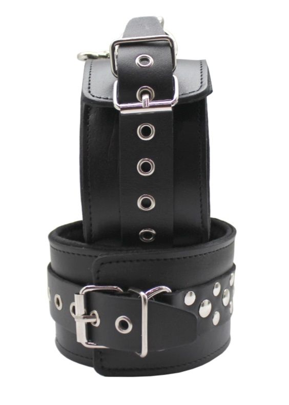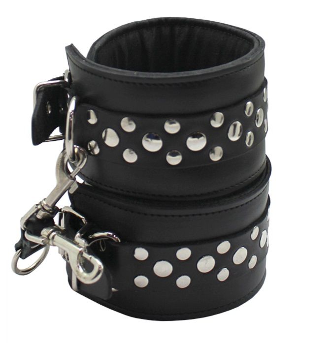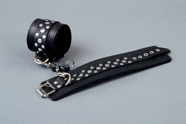 Данный девайс изготовлен из лаковой натуральной кожи, поножи украшены геометрическим рисунком из двух видов заклепок. Поножи фиксируются при помощи ремешка с пряжкой. D - образные кольца позволяют присоединять различные бондажные системы (карабины, ленты, веревки). Подкладка обеспечивает комфортное использование и безопасность. Ширина - 5 см. Минимальный обхват ноги у щиколотки - 33 см, максимальный - 55 см.