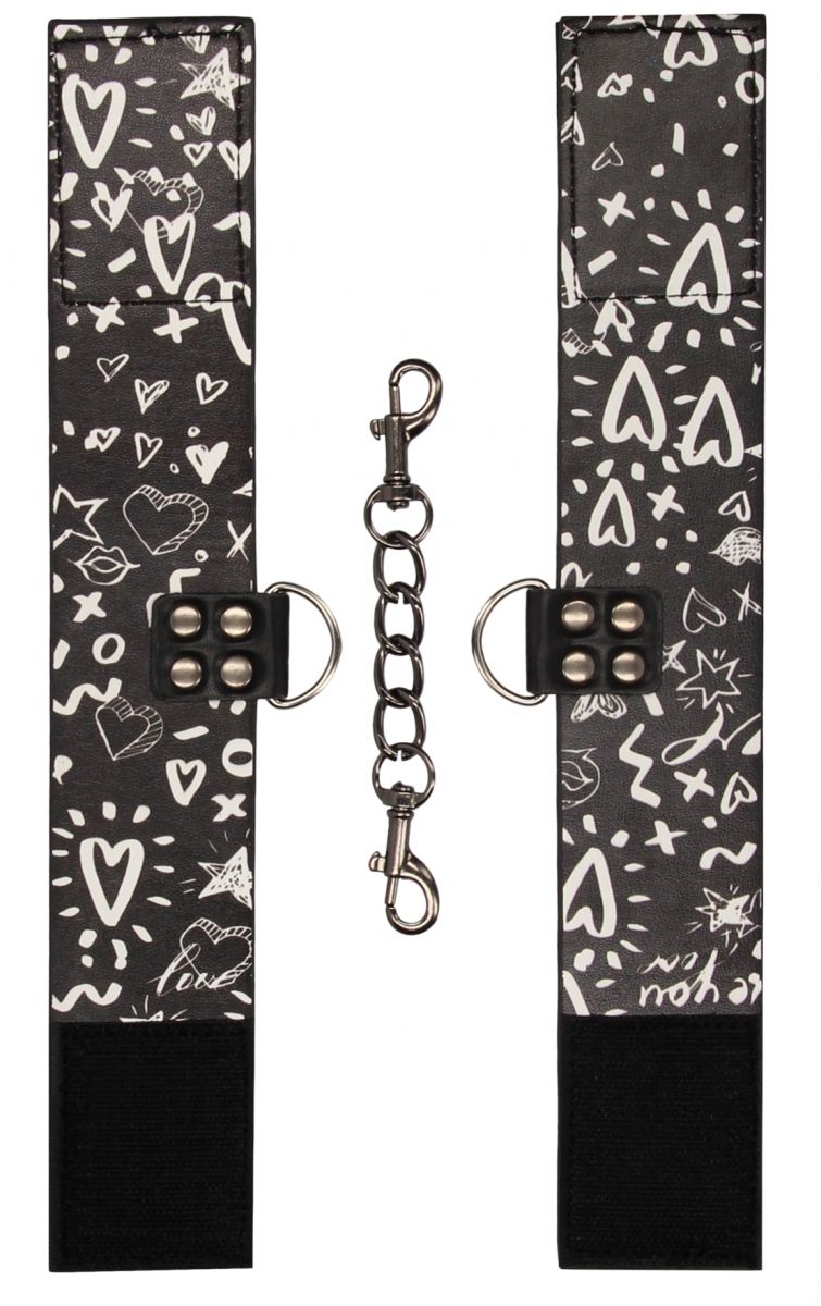Поножи Love Street Art Fasion - специализированное приспособление для обездвиживания партнера при эротических ролевых играх и практиках БДСМ. Аксессуар состоит из двух широких полос, выполненных в необычном стиле, из мягкого материала, который не повредит нежную кожу. Благодаря удобным липучкам, можно легко подобрать оптимальный размер. Каждый манжет оснащен металлическим кольцом и универсальным карабином, с помощью которых они соединяются.