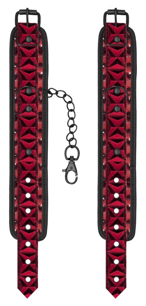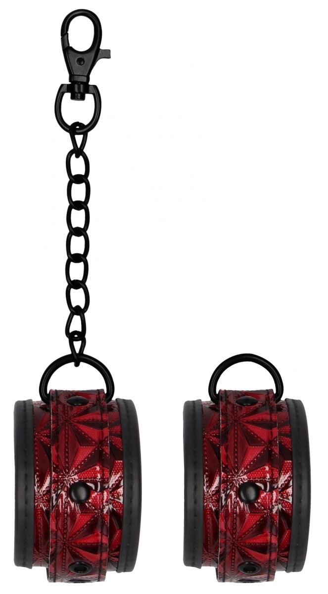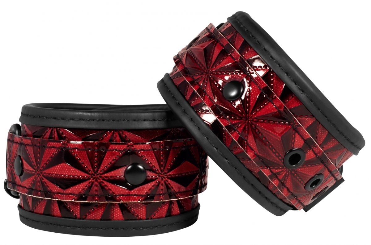 Поножи Luxury Ankle Cuffs - специализированное приспособление для обездвиживания партнера при эротических ролевых играх и практиках БДСМ. Аксессуар состоит из двух сверхпрочных и стильных широких полос из блестящего винила с ромбовидным рисунком, соединенных между собой снимающейся зачерненной цепочкой с карабинами по обоим бокам. Для максимального комфорта во время использования наножники имеют мягкую вставку из неопрена, закрывающую швы и стыки и защищающую лодыжки. Сочетание бургундского красного с черным делают оковы более эффектными и роскошными. Фиксация осуществляется с помощью ремешка с классической пряжкой. Имеется 7 отверстий, за счет чего можно идеально подобрать требуемый размер с идеальным плотным обхватом.