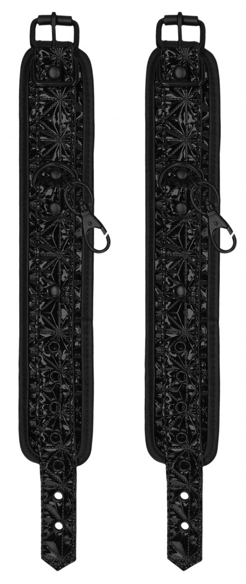 Поножи Luxury Ankle Cuffs - специализированное приспособление для обездвиживания партнера при эротических ролевых играх и практиках БДСМ. Аксессуар состоит из двух сверхпрочных и стильных широких полос с карабинами из блестящего винила с ромбовидным рисунком, соединенных между собой снимающейся прочной металлической распоркой с кольцами по обоим бокам. Для максимального комфорта во время использования поножи имеют мягкую вставку из неопрена, закрывающую швы и стыки и защищающую лодыжки. Фиксация осуществляется с помощью ремешка с классической пряжкой. Имеется 7 отверстий, за счет чего можно идеально подобрать требуемый размер с идеальным плотным обхватом. Длина распорки - 72 см.