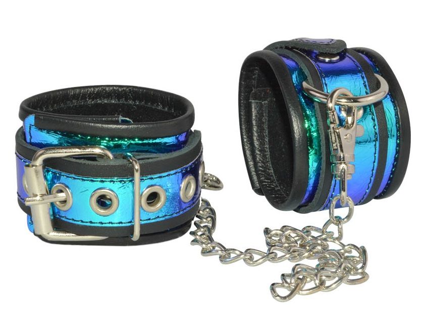 Оковы из натуральной черной кожи, с декоративной голграфической отделкой из искусственной кожи. Подогнать изделие по размеру можно при помощи пряжек. Соединяются оковы цепочкой с двумя карабинами.