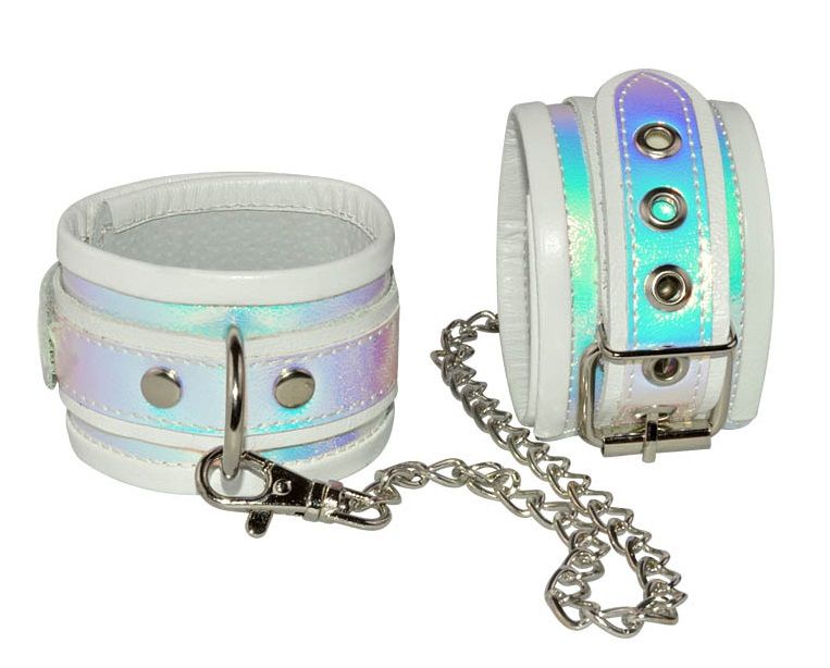 Оковы из натуральной белой кожи, с декоративной голграфической отделкой из искусственной кожи. Подогнать изделие по размеру можно при помощи пряжек. Соединяются оковы цепочкой с двумя карабинами.