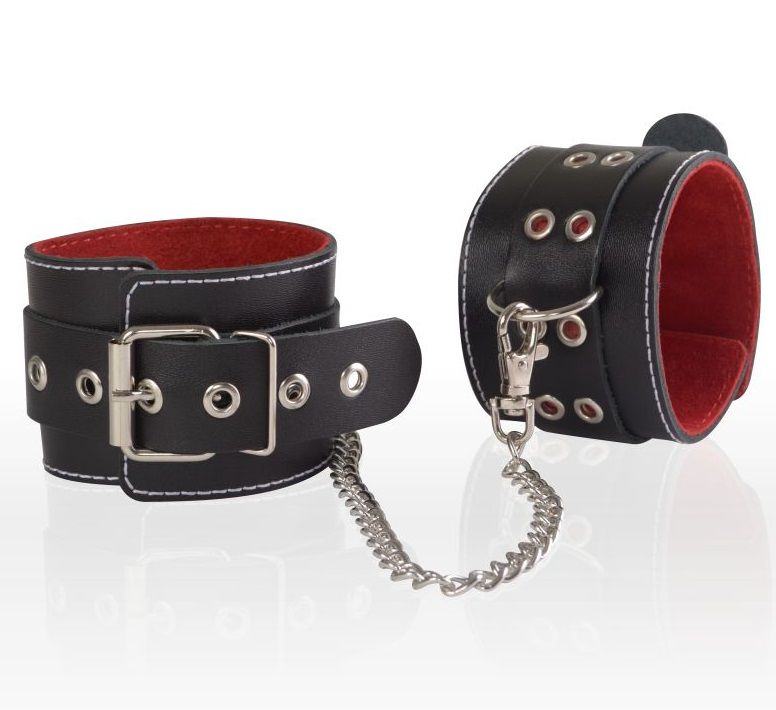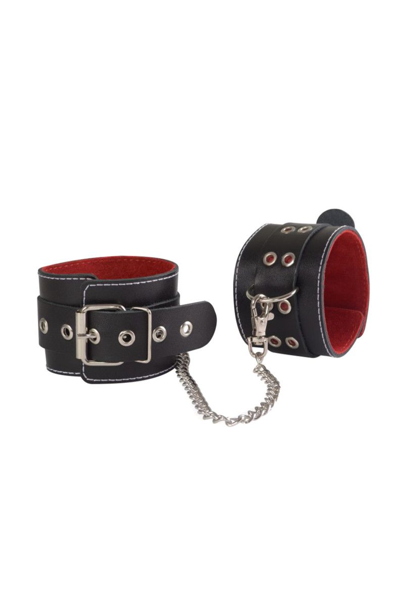 Черные кожаные оковы с красной изнанкой.