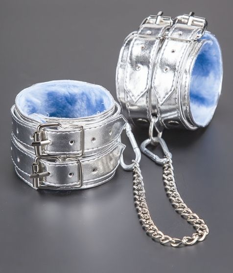 Оковы. Изготавливаются из искусственной кожи. С внутренней стороны подклада их мягкого меха. При изготовлении использована фурнитура с никелевым покрытием. Соединяются между собой цепочкой с двумя карабинами на концах. Не нарушают кровообращение, надёжно фиксируются на щиколотках с помощью двух ремешков. Размер универсальный. Длина цепи - 35 см.