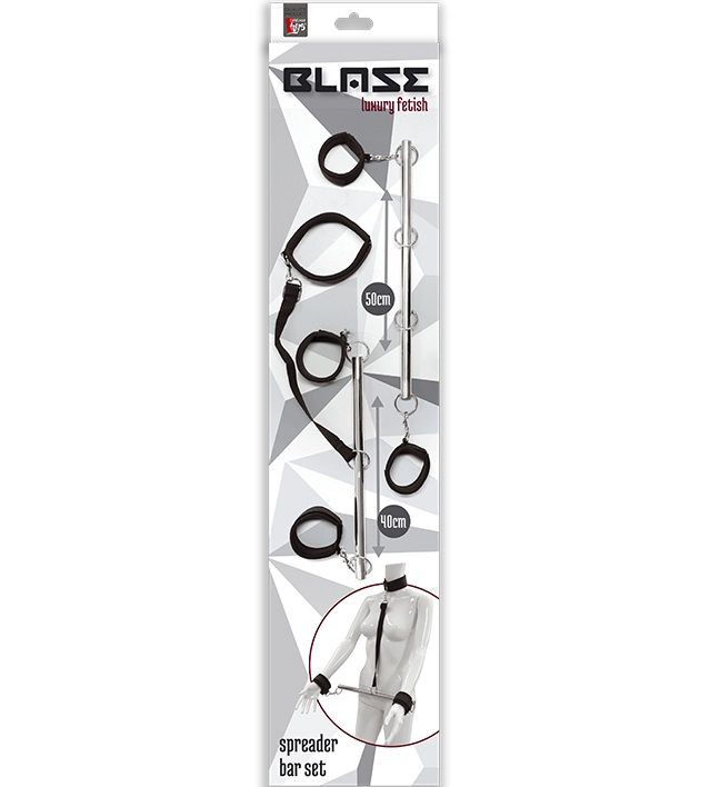 Набор металлических распорок с неопреновыми манжетами BLAZE SPREADER BAR SET. В комплект входит распорка для рук, распорка для ног и ошейник, который можно зафиксировать за распорку. Длина распорок - 50 и 40 см.