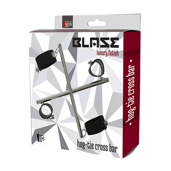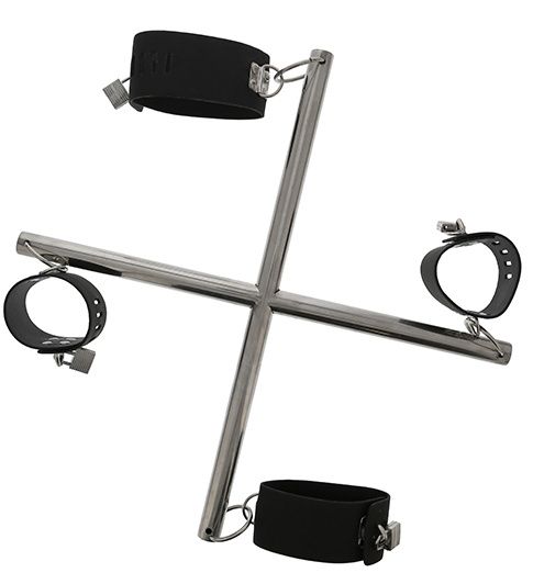 Комплект Hog-Tie с кожаными наручниками и поножами. Манжеты прикреплены к концам поперечин с помощью металлических уплотнительных колец. Манжеты легко регулируются по размеру и закрываются при помощи висячих замков.